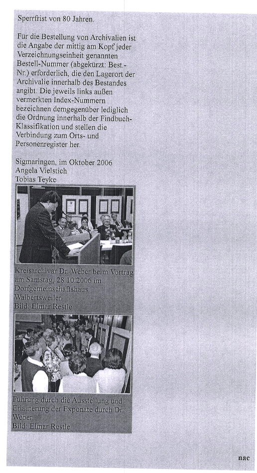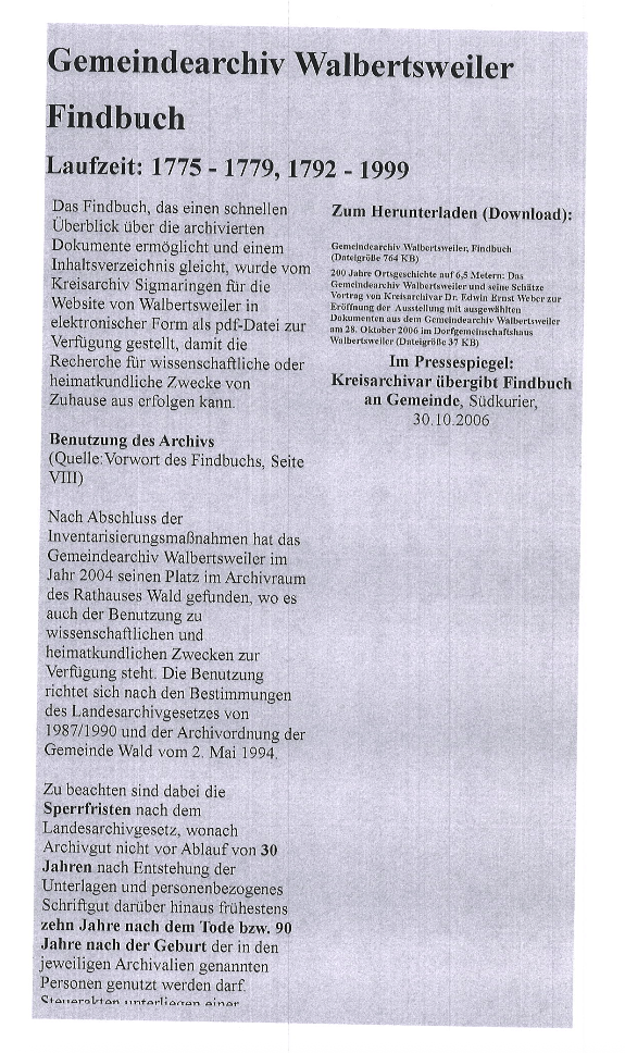 Vortrag von Kreisarchivar Dr. Edwin Ernst Weber zur Eröffnung einer Ausstellung mit ausgewählten Dokumenten aus dem Gemeindearchiv Walbertsweiler am 28. Oktober 2006 im Dorfgemeinschaftshaus Walbertsweiler