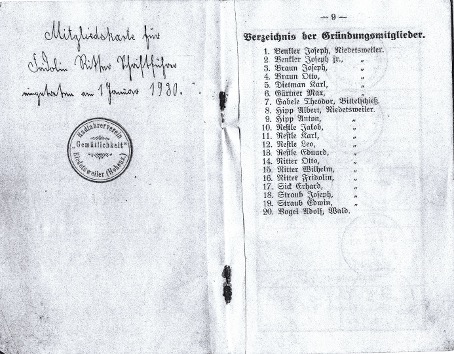 Dieses kleine Heftchen des Radfahrervereins „Gemütlichkeit“ Riedetsweiler wurde uns von Franz Ritter zur Verfügung gestellt. Es handelt sich um die Mitgliedskarte vom Schriftführer des Vereins, Fridolin Ritter, aus dem Jahr 1930. Aufgeführt sind die Gründungsmitglieder des Vereins.